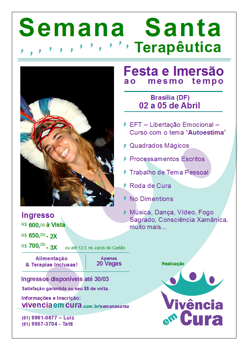 Semana Santa 2015 - Vivência em Cura 02 a 05 de Abril - Brasília (DF) Local: Espaço Anahata - Sede Vivência em Cura - Brasília (DF) Vivências Inclusas: - Libertação Emocional - EFT com o tema "Autoestima" - curso Terapias Individuais Disponíveis: - EFT – Libertação Emocional Alimentação Inclusa: Café da Manhã; Almoço; Jantar; Água e frutas ao longo do dia. Agenda: Quinta à Noite – 02/04 - A partir 19:00h – Recepção - Janta - Roda de Abertura – rito da fogueira / definição de propósitos individuais etc. Sexta /